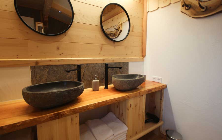 Geräumiges Bad mit Dusche, Waschtisch mit Naturstein-Becken, Haar Föhn, Schminkspiegel, Kosmetiktücher, Seife, Hand- und Badetücher für den gesamten Aufenthalt, dazu noch eine Waschmaschine.