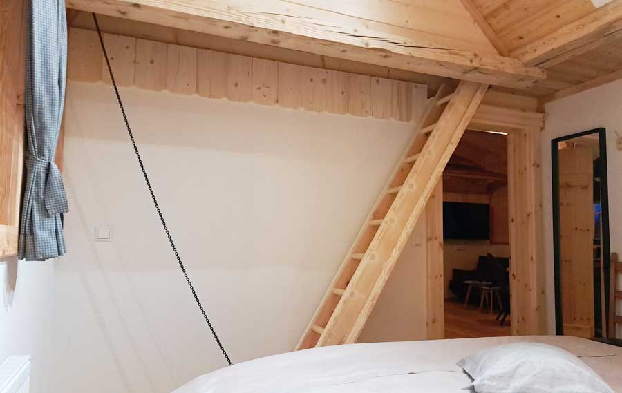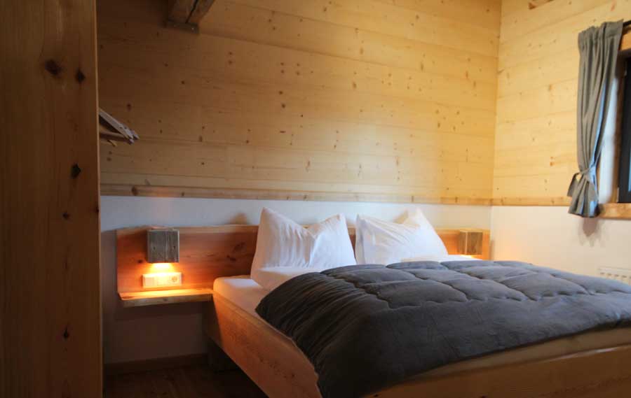 Vollholz Doppelbett aus Heimischer massiv Kiefer, 7 Zonen Kaltschaummatratze, Massivholz Kleiderablage, sanfte Bettwäsche zum Kuscheln. Ein Hochbett für Heu-Stadel-Feeling. ( für 2 Kinder ab 6 bis 12 Jahre ) über den Schlafzimmern.