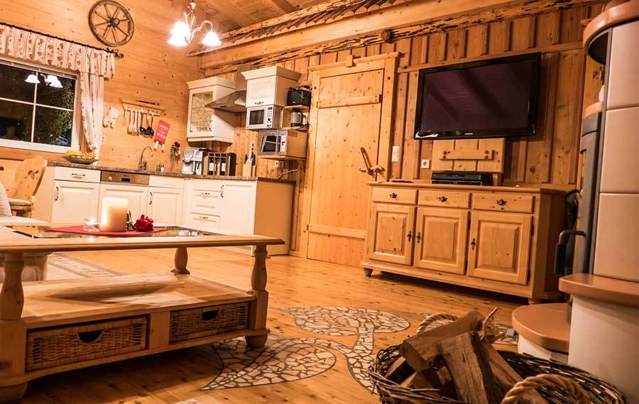 Einen Kaminofen mit Sichtglas inklusive Brennholz für Ihren ganzen Aufenthalt. Eine komfortable Schlafcouch für 2 Personen, Sat-TV und freier Zugang zum Internet.