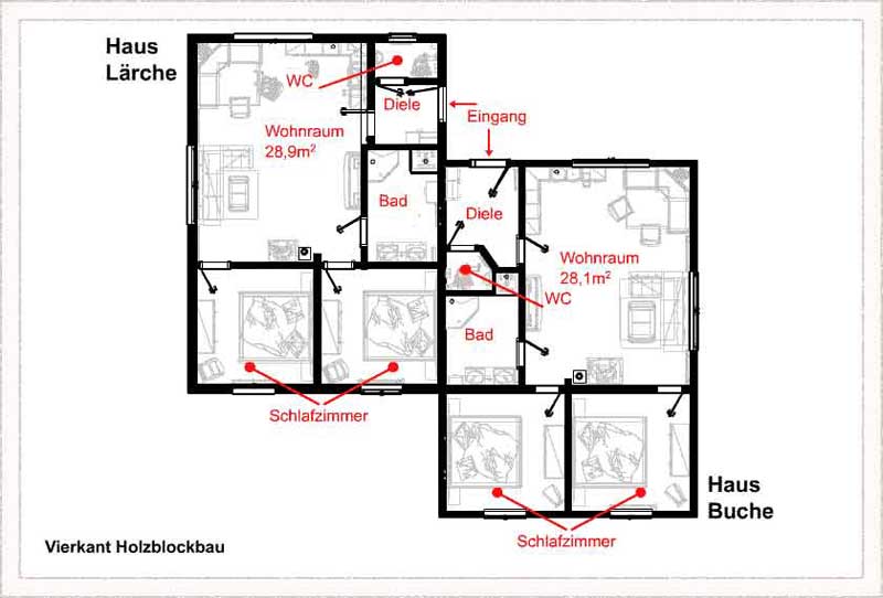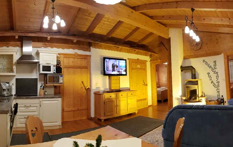 Das Ferienhaus Lärche ist ein liebevoll gestaltetes Blockhaus mit Platz für bis zu 6 Personen. Es beeindruckt durch rustikale Bauweise, natürlichen Charme und moderne Ausstattung. Nach einem erlebnisreichen Tag lädt der Kamin zum Entspannen ein. Als Doppelhaus mit dem Chalet Buche eignet es sich perfekt für befreundete Familien oder Gruppen bis 12 Personen, die gemeinsam Urlaub machen und dennoch Rückzugsmöglichkeiten genießen möchten. Die offene Küche mit Sitzecke, das durchdachte Raumkonzept und die barrierefreie Bauweise machen Ihren Aufenthalt komfortabel und unvergesslich.