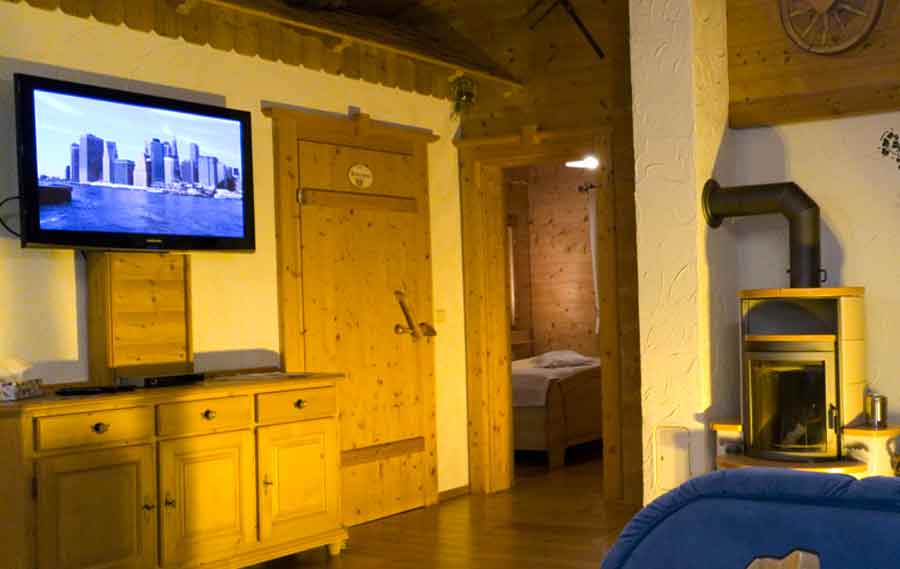 Einen Kaminofen mit Sichtglas inklusive Brennholz für Ihren ganzen Aufenthalt. Eine Komfortable Schlafcouch für 2 Personen, Sat-TV und freier Zugang zum Internet.